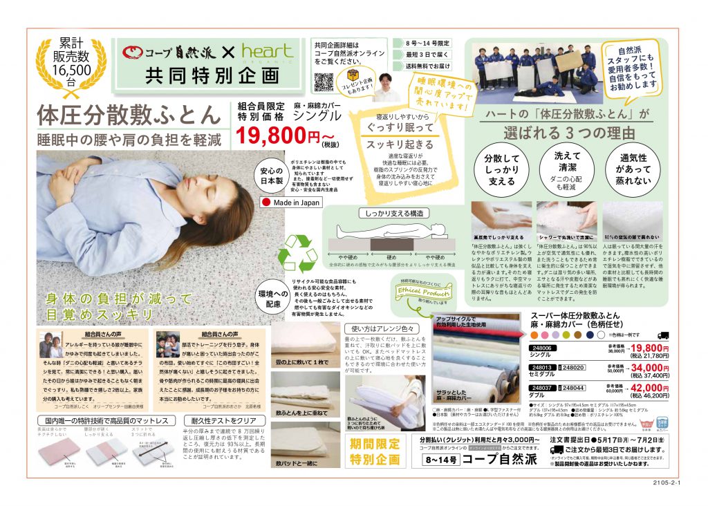 コープ自然派の食材で充実した食事を、睡眠はheartの体圧分散敷ふとんで快適にしませんか?