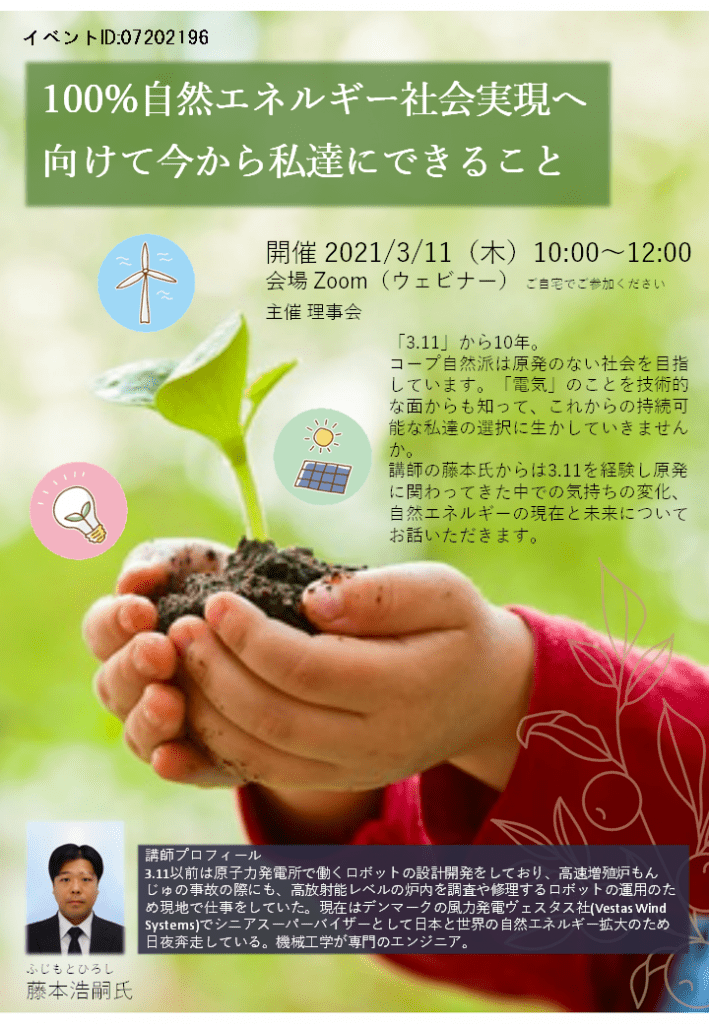 締切延長しました 3/11 100%自然エネルギー社会実現へ向けて 今から私達にできること