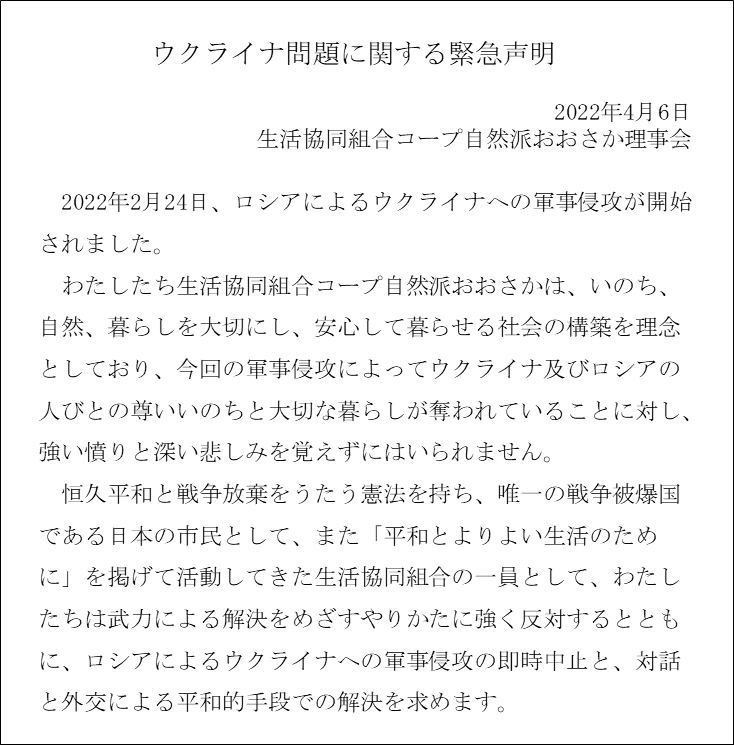 ウクライナへのロシア軍の侵攻についてコープ自然派理事会はロシア連邦在大阪総領事館宛に以下の声明を送付しました。