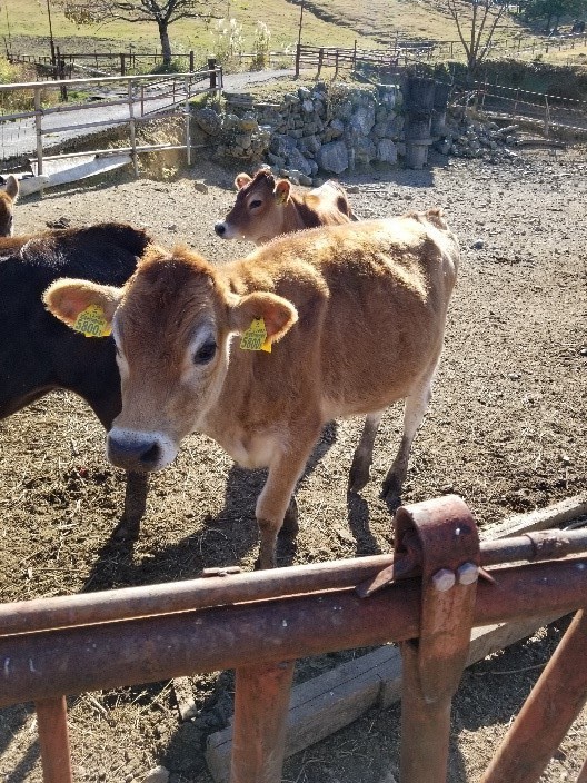 牧場に到着すると先ず出迎えてくれたのが生後2か月から半年までの子牛たち、初めての私たちにも人懐っこく柵の近くまで近寄って来ました。これは、産まれた時から大切に育てられている証です。