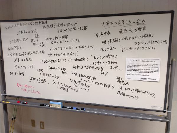 ➀多くの人が不安を抱えている社会では強いアピールに弱くなる。簡単に戦争へとつながる可能性がある。今日本は「平和」だと言い切れるのか。参加者が感じる「不安」を出し合ってみよう(貼付写真)
