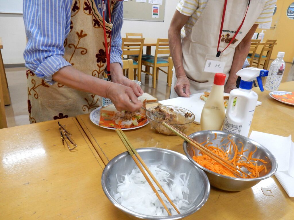 ポスティ掲載のサバ缶カレー味1缶を4人で使用(およそ35g/1人)。玉ねぎと人参はサンドとスープ両方に使えてレシピ効率がよかった。2台のテーブルを繋げて1つの輪になり、各自好みのサバサンドを作成、みんな手際良くゆっくり交流できた。
